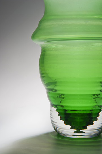 The early stages of glass blowing, balancing heat and shaping molten glass by blowing through a blowing iron, have been recorded by Hillary – by profession and education a digital designer - as sound files, taking the delicate sound of his friend and collaborator, Ford breathing through the iron itself. From the audio files he creates a visual representation using CAD software, before the illustrated sound waves are then turned into a wooden mould to begin the process of encapsulating an ambient sound in a physical object. The final stage in creating the finished glasswork goes right back to the start of the process, with Ford blowing hot, coloured glass through the mould Hillary has prepared to create a highly-detailed pattern as a feature of the finished, glass sculpture.