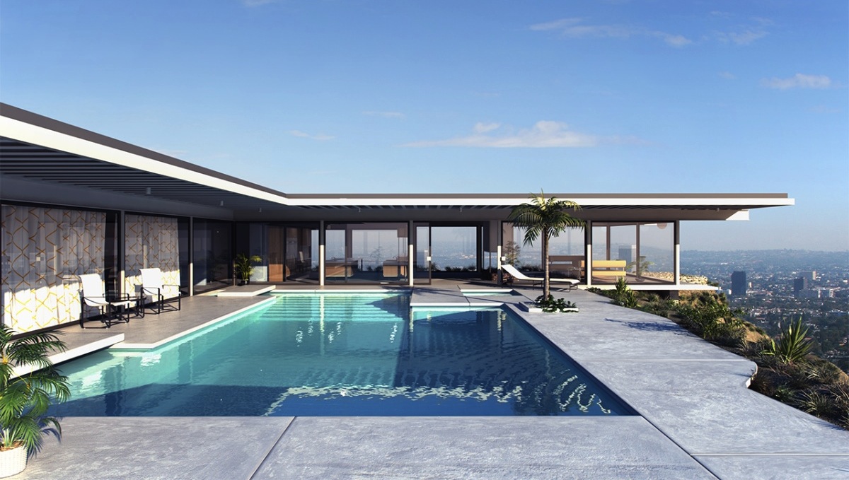 The private and public sectors are connected by a hallway. Compositionally adjacent is the swimming pool that one must cross in order to get into the house; it is not only a spatial division of public and private but its serves as the interstitial space that one must pass through in order to experience the panoramic views. The living space of the house is set back behind the pool and is the only part of the house that has a solid wall.