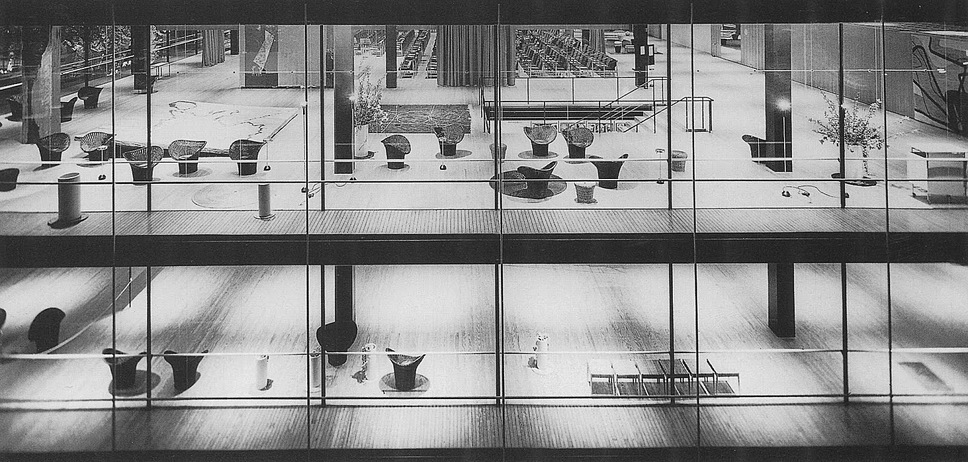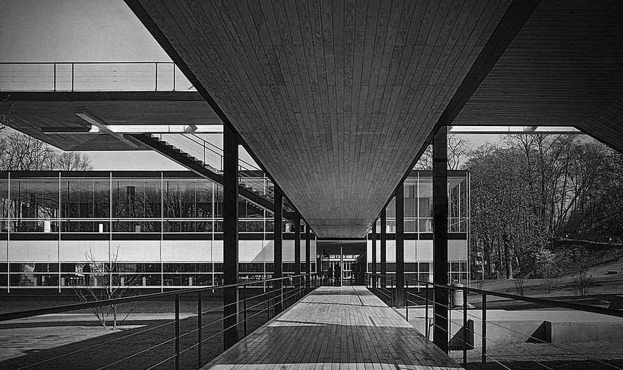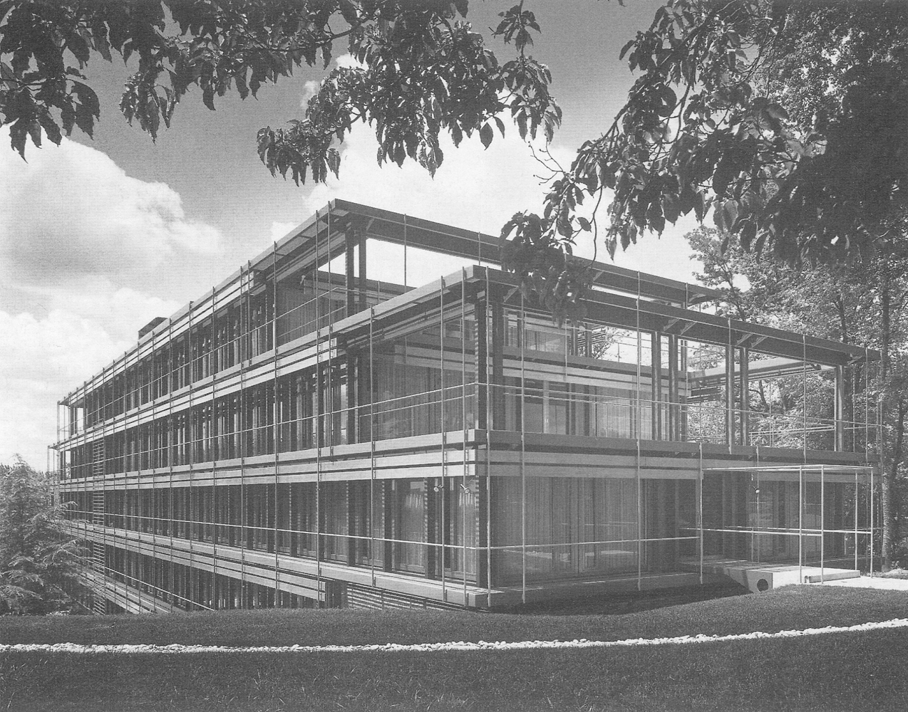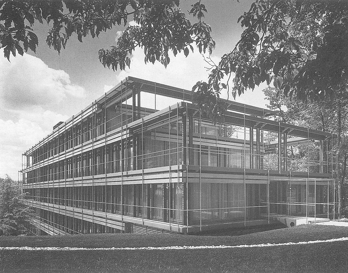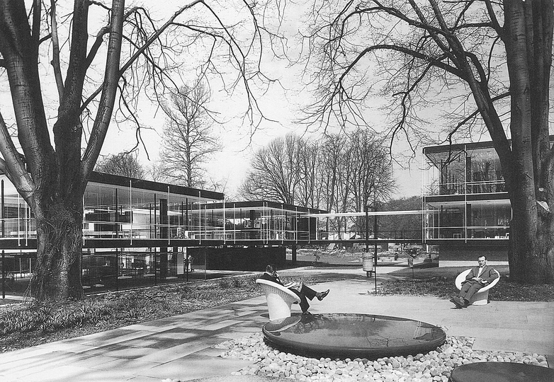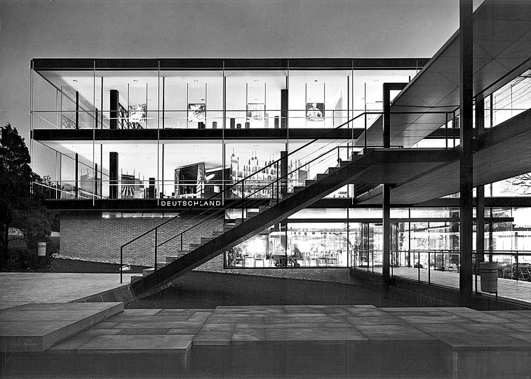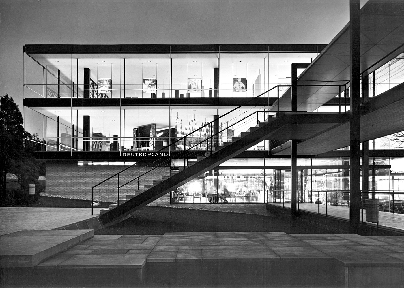Eiermann´s special mixture of rational, modernist and understated with partly American, partly Scandinavian influences fitted the bill, and he was entrusted to design the buildings to represent this new Germany with buildings such as the West German pavilion at the Brussels World Exhibition (with Sep Ruf, 1958), the West German embassy in Washington, D.C. (1958–64), the IBM-Germany Headquarters in Stuttgart (1967), the Olivetti corporate center in Frankfurt am Main, and the former high-rise office building for Members of the German Bundestag in Bonn.